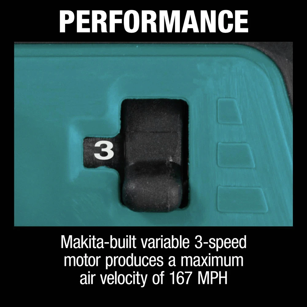 - Makita-built variable 3-speed motor produces a maximum air velocity of 167 MPH