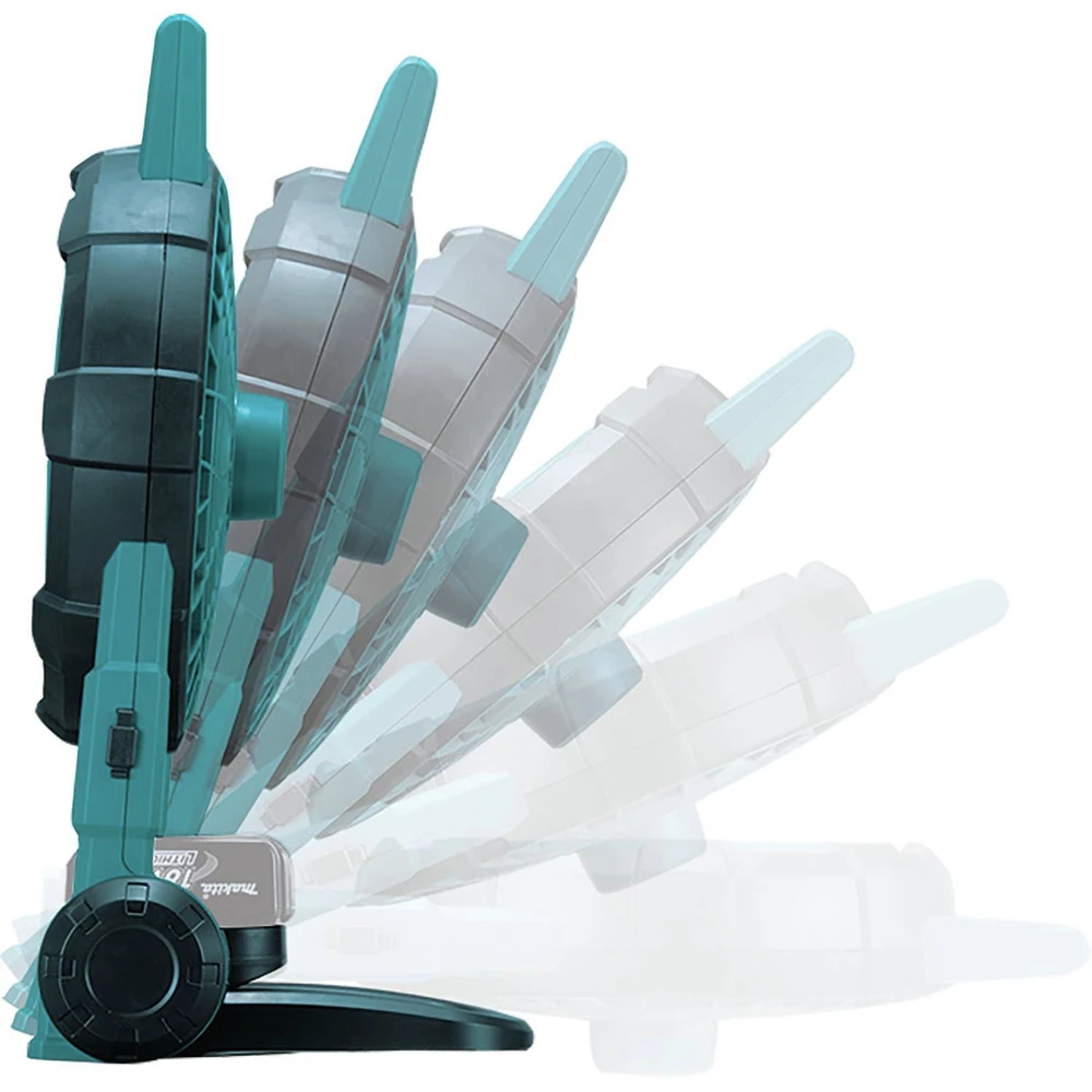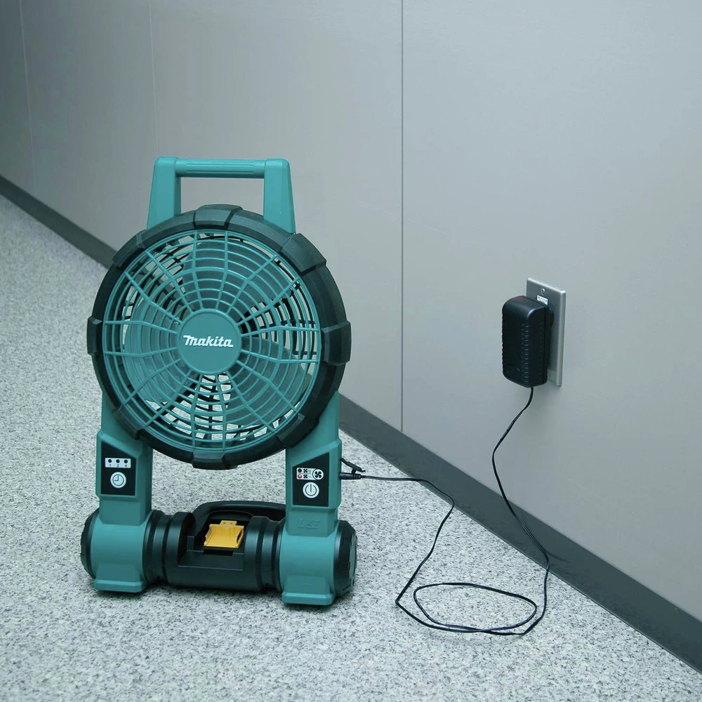 The Makita 18V LXT Li-Ion Cordless Fan (model DCF201Z) is a powerful and portable solution for painters, contractors, and more. The DCF201Z has two settings for optimal air velocity control. It can be powered by Makita 18V Li-Ion batteries, or an AC adapter. The durable design and protective bumpers are engineered to withstand a job site environment.