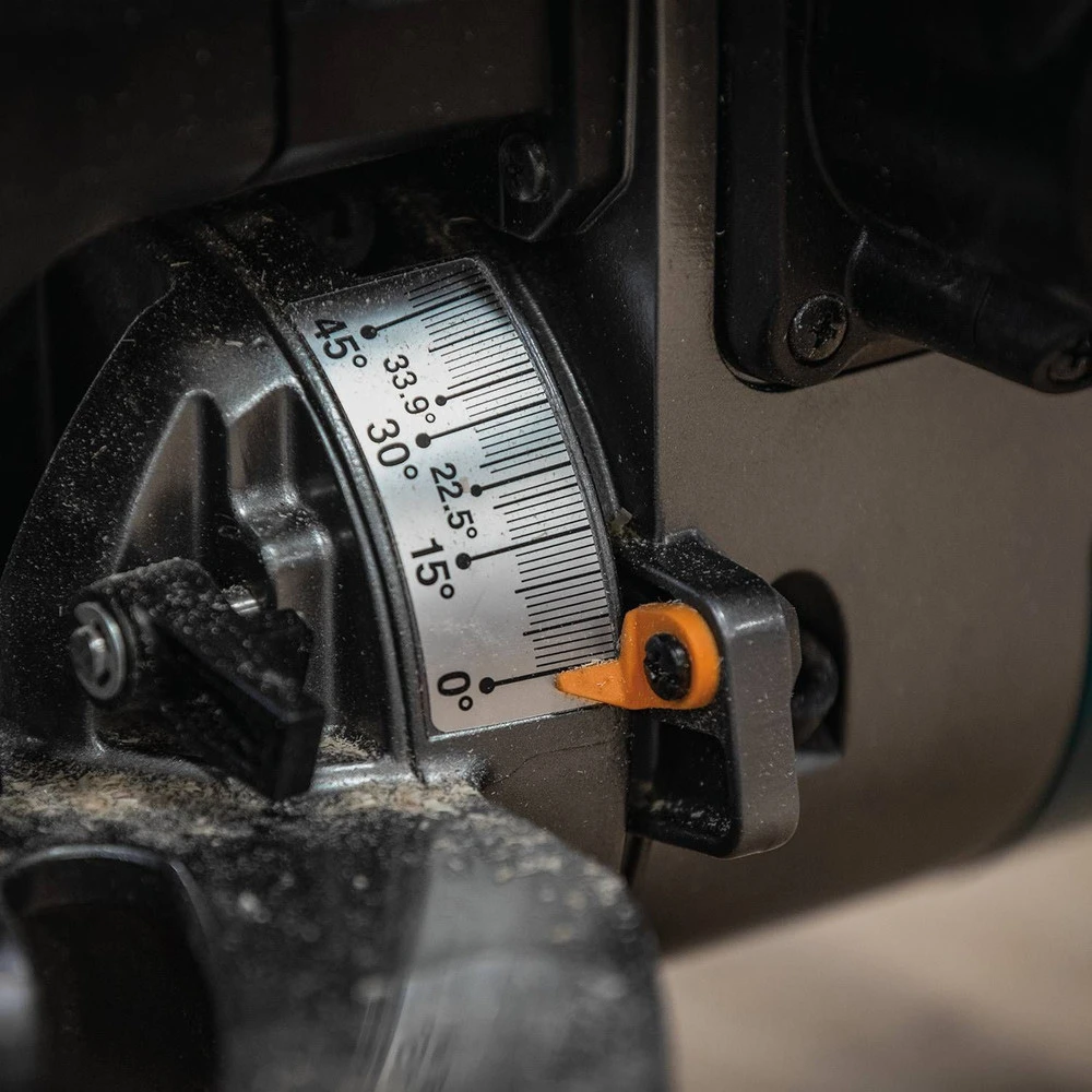 - Bevel angle lock and release dial at front of tool for easy access and repositioning