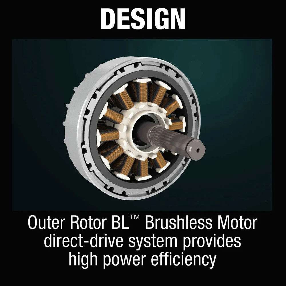 - Makita-built outer rotor brushless motor direct-drive system provides high power efficiency